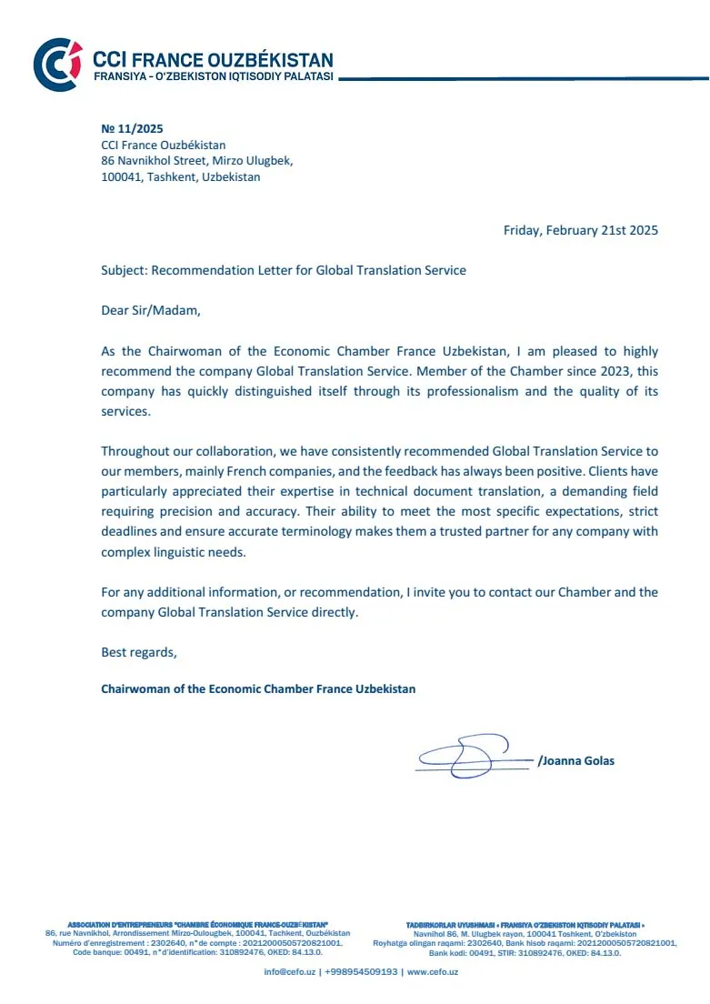 As the Chairwoman of the Economic Chamber France Uzbekistan, I am pleased to highly recommend the company Global Translation Service. Member of the Chamber since 2023, this company has quickly distinguished itself through its professionalism and the quality of its services.